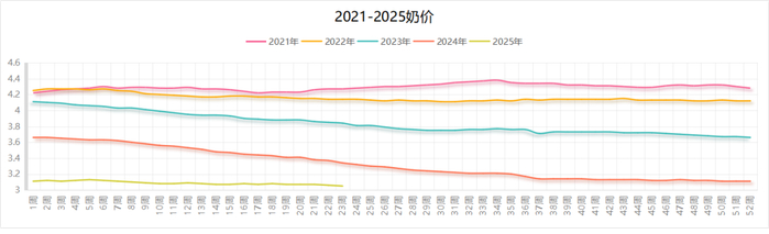 农业部统计截至6月5日,内蒙古/河北等11个生鲜乳主产区合同内外平均收购价格3.05元/公斤,环比跌持0.3%,同比下跌8.1%。(注意:农业部收集数据主要为规模化牧场长协价格为主,和市场最关心的合同外现货奶价有较大差距,请参考该数据时注意)