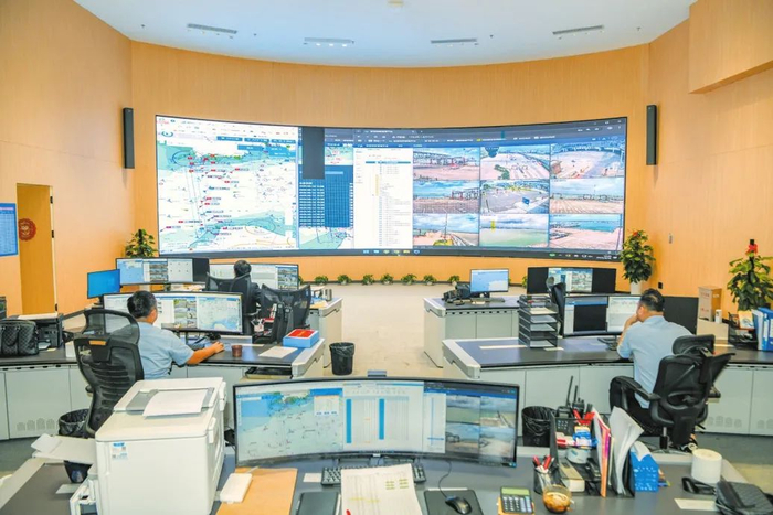 工作人员通过高清摄像头与AIS系统对船舶进行“云点验”,一旦船舶因锚链偏角触发预警,执法人员可通过甚高频电台发出调整指令。苏弼坤/摄