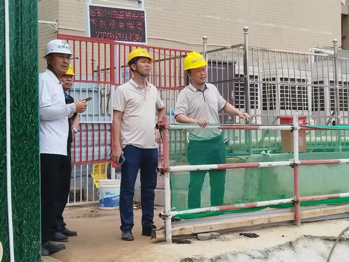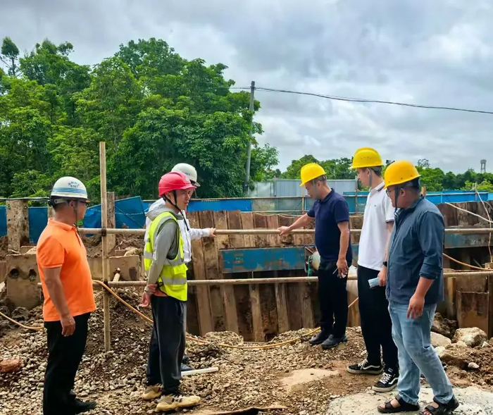 海口市住建局质安站监督人员对海文南路市政化改造工程的基坑进行台风前的安全隐患检查。