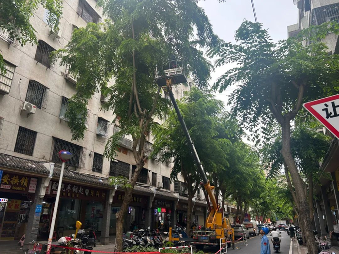 连日来,琼山区园林管理局出动5支队伍共计100余名专业园林工人,调配高空作业车、电锯等专业设备,对辖区主次干道的树木展开全面排查和修剪。