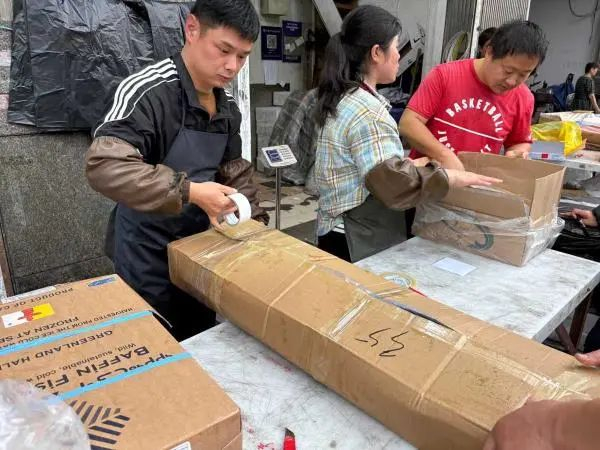 正值东海休渔期,在宁波最大的海鲜交易市场——宁波水产品批发市场,冻品交易区一片繁忙景象,各家水产档口的工人们穿梭于冷库与摊位之间,忙着搬货、理货,将一箱箱冻品整齐排好,而选购的中小商户络绎不绝。