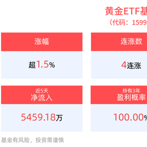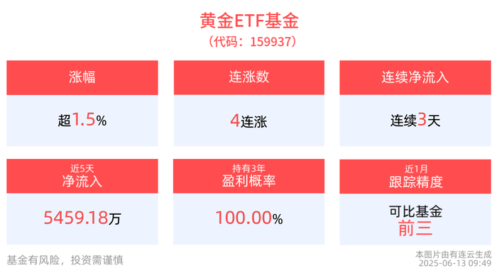地缘政治持续升级驱动黄金上涨,黄金ETF基金(159937)上涨1.58%,冲击4连涨