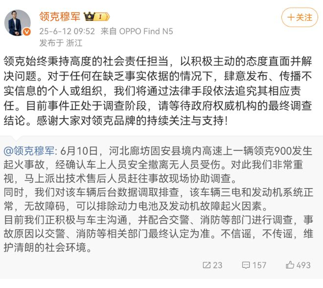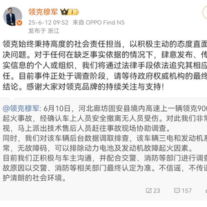 6月12日上午,领克汽车副总经理穆军再次回应“领克900全国首台自燃”,称目前正处于调查阶段,在11日晚,穆军即回应河北廊坊固安县境内高速上一辆领克900发生起火事故,确认车上人员安全撤离无人员受伤。