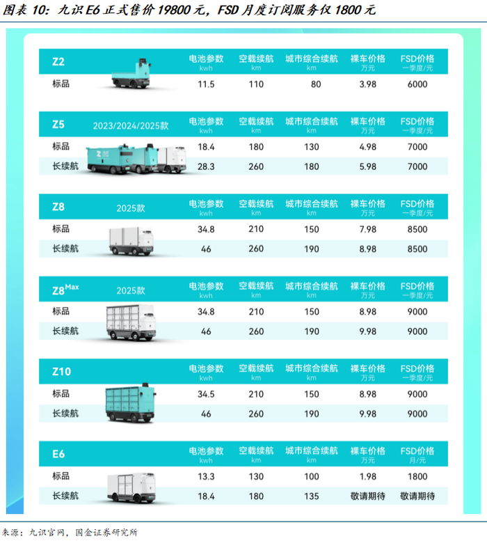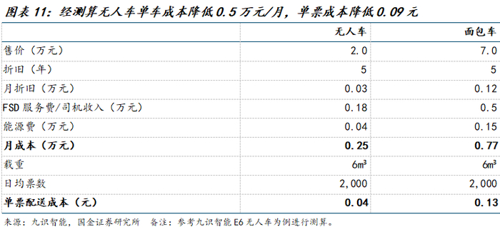 部分无人物流车价格大幅下降。2025年5月27日,九识正式发布全新E系列无人物流车平台及首款车型E6,正式售价19800元,FSD(完全智能驾驶)月度订阅服务,低至1800元/月。据测算,该款车辆的单月使用成本仅为0.25万元(包括车辆折旧、FSD服务费、电费),低于传统物流车的0.77万元(包括车辆折旧、司机工资、油费),若单日票数为2000票,单票配送成本可降低至0.04元。