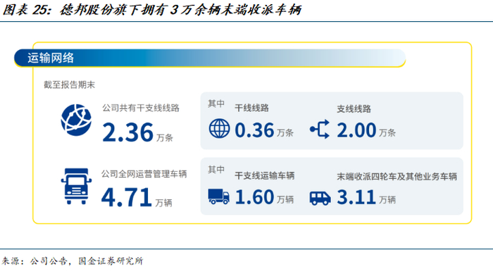 参股无人叉车和货车辅助驾驶公司。德邦股份全资子公司宁波德邦基业持有上海木蚁机器人11.3%股份,后者专注于无人驾驶搬运机器人和应用方案的研产销,打造智能制造行业无人搬运机器人,其服务的总客户占快运市场 70%,总无人搬运吨量 200 万吨。此外,2021年德邦股份参与自动驾驶卡车技术与运营公司嬴彻科技2.7亿美元B轮股权融资,赢彻科技专注于干线物流场景,截至2025年搭载嬴彻技术的商用卡车行驶里程超2亿公里。