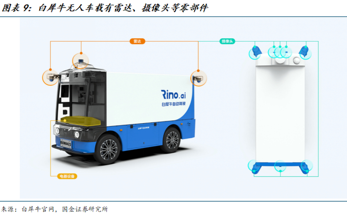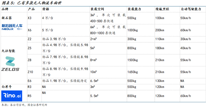 多家公司提供无人物流车产品,成本降至2万元。目前多家公司推出无人车产品,包括新石器、九识智能、白犀牛等初创公司以及菜鸟、美团、京东物流等物流企业。在快递快运末端配送环节,上述企业的无人车经过多次迭代,已具备L4级别自动驾驶能力,可装载200-1000票快递,续航能力超过100公里,单价已从十几万元降至2万元,有效减轻末端配送成本。