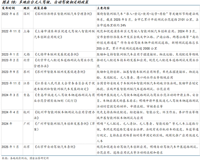 多地政府亦出台无人驾驶、自动驾驶相关的配套政策,明确车辆测试和应用机制。2024年7月,工业和信息化部联合多部门发布《关于公布智能网联汽车“车路云一体化”应用试点城市名单的通知》,包括北京、上海、重庆等20个城市列入名单。2025年6月,北京、上海等多个城市集中发放无人配送车路权牌照,允许车辆在非机动车道行驶,例如新石器已获得 250 多个地市公开道路路权。