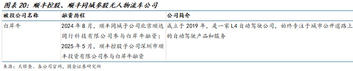 参股无人物流车厂商。2025年5月,低速无人驾驶公司白犀牛完成2亿元B轮融资,本轮由顺丰控股(通过子公司深圳市顺丰投资有限公司)领投,鑫源汽车与老股东线性资本跟投,本轮融资主要用于新的低速无人车产品开发,以及现有产品市场推广。此前,2024年8月,顺丰同城子公司北京顺达同行科技有限公司亦参与白犀牛融资。