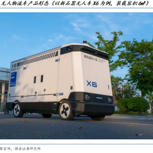 无人物流车应用场景广泛,产品迭代迅速。无人物流车是基于自动驾驶技术的智能运输工具,目前主要应用于快递快运末端配送(如网点到社区驿站),此外也可用于封闭场景物流运输、商超生鲜配送等,应用领域广泛。目前多家公司推出无人车产品,包括新石器、九识智能、白犀牛等初创公司以及菜鸟、美团、京东物流等物流企业。在快递快运末端配送环节,上述企业的无人车已具备L4级别自动驾驶能力,可装载200-1000票快递,续航能力超过100公里,单价从十几万元降至2万元,有效减轻末端配送成本。