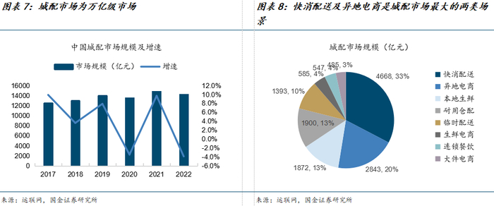 无人物流车可替代城配市场运力,市场空间广阔。无人物流车等设备已广泛应用于快递、B2C零售、外卖商超及生鲜配送等多个领域,对应可替代的是城配市场运力,目前仅微卡及交叉型乘用车数量就达600多万辆。无人配送车市场空间广阔,根据运联网数据,2022年城配市场规模为14292亿元,从细分市场来看,快消配送市场规模4668亿元,占比33%;异地电商配送市场规模2843亿元,占比20%,为城配市场最大的两类场景。其他占比较高的场景还包括本地生鲜(占比13.1%)、耐用仓配(占比13.3%)、临时配送(占比10%)等。