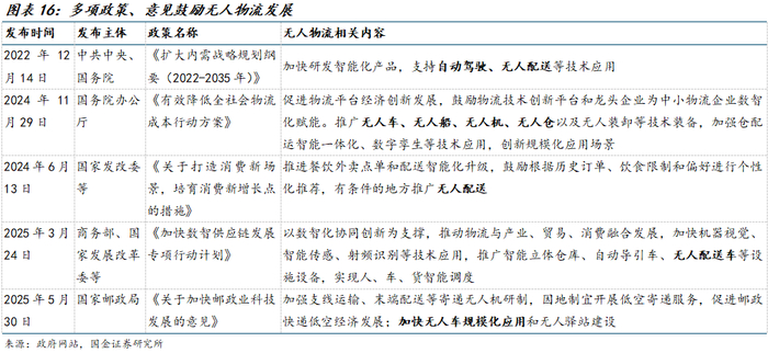 当前我国正大力推动无人配送服务的规模化与商业化发展,多项政策规划将其列为重点。快递行业方面,2025年5月30日,国家邮政局举行专题新闻发布会,解读《国家邮政局关于加快邮政业科技发展的意见》,提出“深化人工智能技术和产品在行业的推广应用,加快推动无人机、无人车、智能云仓在行业规模化应用”。