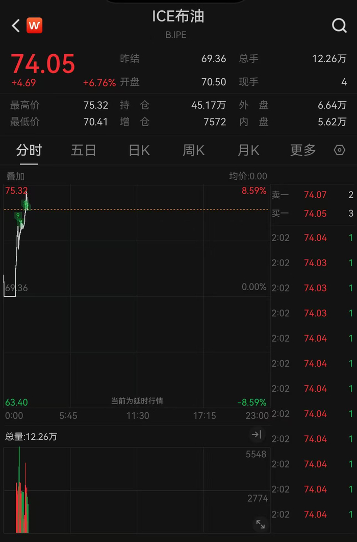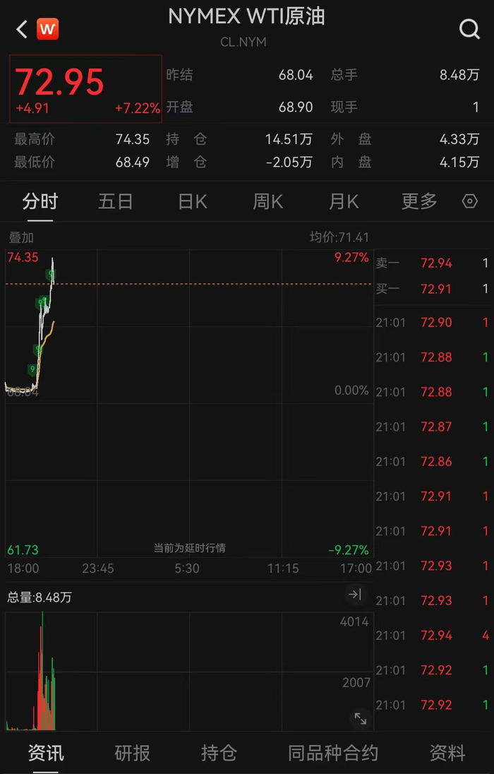 国际油价快速拉涨,WTI原油报72.95美元/桶,涨超7%;ICE布油报74.05美元/桶,涨超6%。