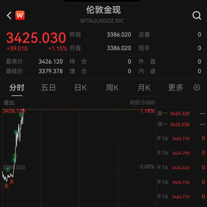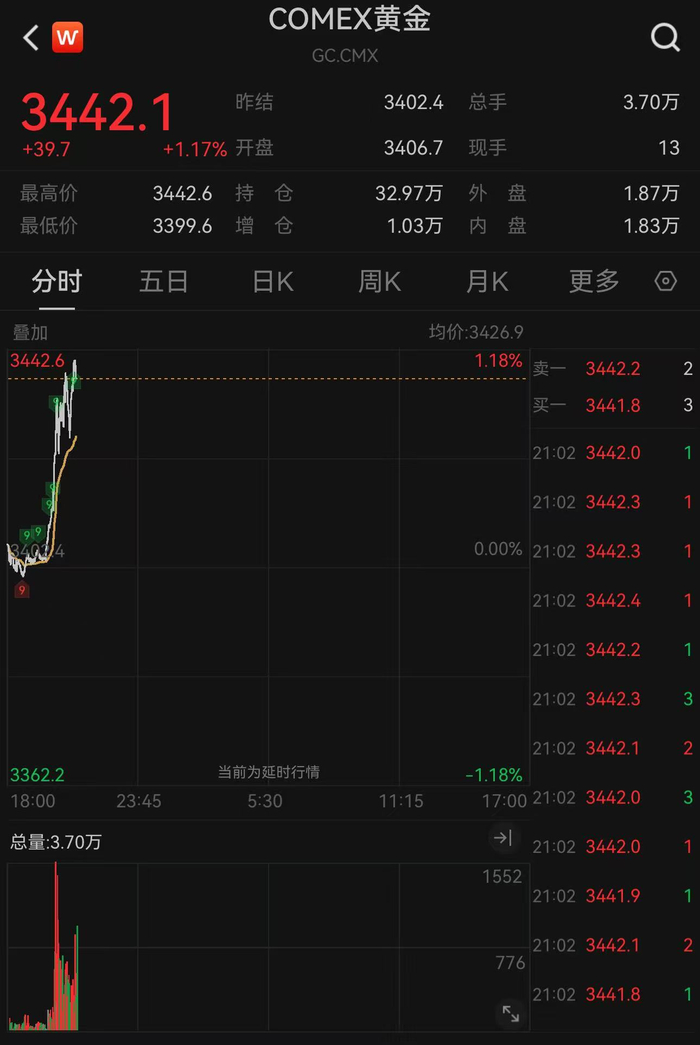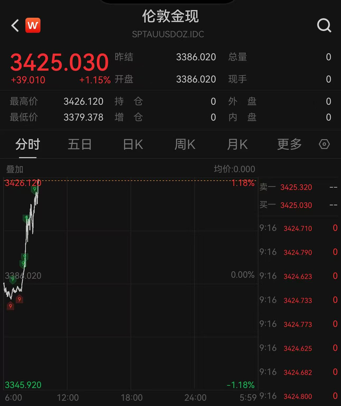 截至北京时间9:17,现货黄金价格报3425.03美元/盎司,COMEX黄金报3442.1美元/盎司,均涨超1%。沪金主力合约大幅高开,涨超2%,报797.72元/克。