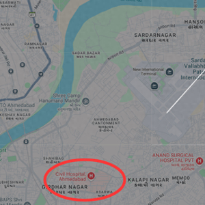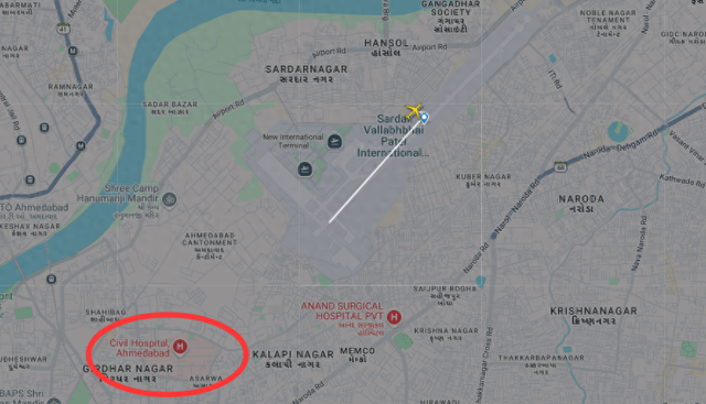 根据印度航空171航班ADS-B数据还原的轨迹,红圈为飞机坠毁所在的医院