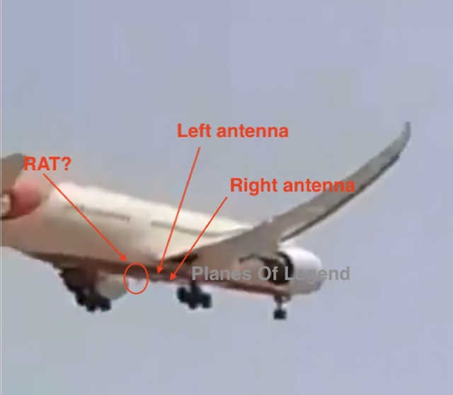 至于空中放出RAT,那就更令人惊悚了。RAT是在飞机失去电力时提供紧急电力所用的,在发动机双发失效或者液压三路失效等情况下才会自动启动。虽然视频清晰度不高,而且该位置也有天线,但一些角度可以清楚看到疑似RAT放出,而且录像里飞机的声音也符合释放RAT后发出的嗡嗡声。