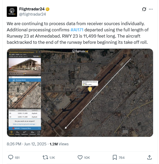 由于ADS-B数据问题,使得事故一开始被认为事故飞机只使用了一半跑道。而该航班执行印度-英国航线,且满客,因此飞机处于满载满油的状态,起飞重量较大。再加上地表大气温度37度使得发动机推力有一定损失,若使用一半跑道起飞会非常极限,也因此被猜测是否是导致空难发生的因素之一。