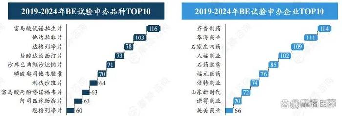 近六年BE试验数量前十品种中,富马酸伏诺拉生片、他达拉非片、达格列净片登记试验数量最多,分别有116项、103项、78项。