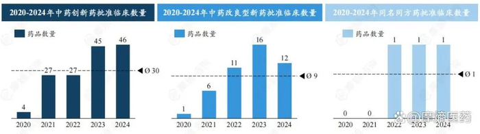 1类中药创新药中,2020-2024年获批临床药品数不断提升,从2020年4款提升至2024年46款,五年合计获批临床数量达149款;2类中药改良型新药中,2020-2023年获批临床药品数稳步攀升,2023年达16款,2024年跌落至12款,五年合计获批临床数量达46款。