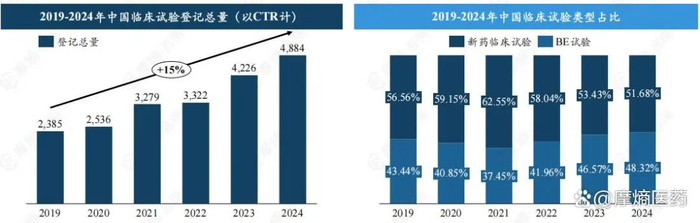 近年来中国新药注册临床试验数量逐年增加,据摩熵医药中国临床试验数据库显示,2019-2024年中国临床试验登记总量由2385项提升至4884项,年复合增长率达15%,其中2023年首次突破4000大关,达4226项,2024年持续增长至4884项,预计将快速突破5000项。