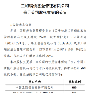 公告内容显示,证监会已核准瑞士银行有限公司(UBSAG)成为工银瑞信基金持股5%以上股东,本次股权变更的工商变更登记手续已办理完毕。本次股权变更后,工银瑞信基金的第一大股东仍为工商银行,持有股权比例为80%;瑞银则以20%的持股比例成为第二大股东。
