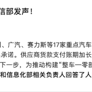 今日,工信部也发声称:“汽车企业主动承诺“支付账期不超过60天”,是积极响应国家号召、践行社会责任与企业担当的体现,对构建“整车—零部件”协作共赢发展生态、促进产业健康可持续发展具有重要意义,我们对此高度赞赏。”
