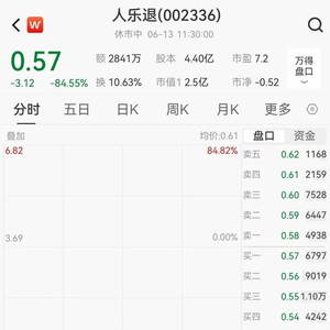 今日(6月13日),人人乐连锁商业集团股份有限公司(简称:人人乐/人乐退,代码:002336)进入退市整理期,盘中跌幅超过84%。