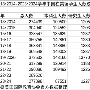 国人对赴美留学的态度变化也体现在数据上。由美国教育协会每年发布的《美国门户开放报告》显示,2022年,中国赴美留学生首次跌破30万,2023年人数持续下跌,2023-2024学年,印度超过中国成为赴美第一大国际生源地,中国赴美留学人数则降至10年前的水平,较2019/2020学年的峰值减少9.5万,但中国学生在美人均开销暴增(5.2万美元/年,包括学费生活费等),同比增长1万美元。