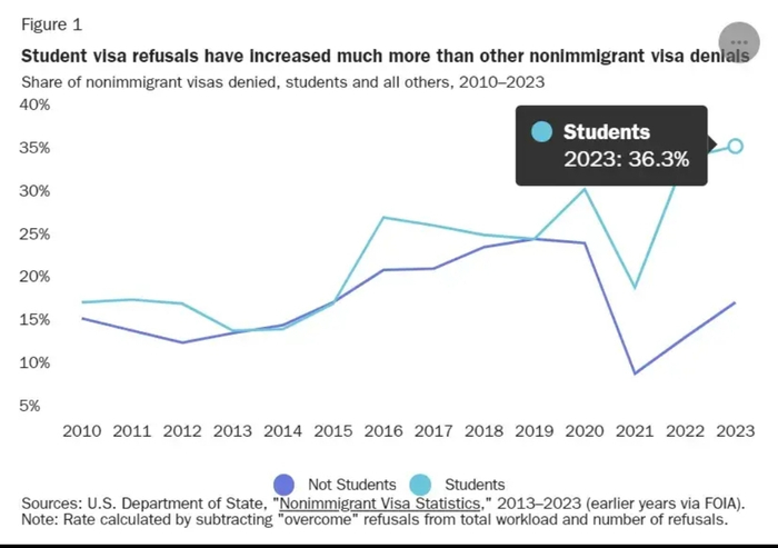 与此同时,美国对全球留学生的签证拒签率也在上升,2023年有253355名国际学生的赴美签证被拒签,占学生签证申请人数的36%,创历史新高,而2015年的拒签率只有15%。
