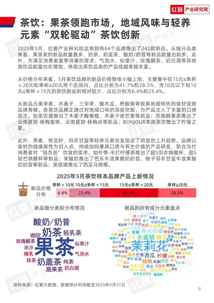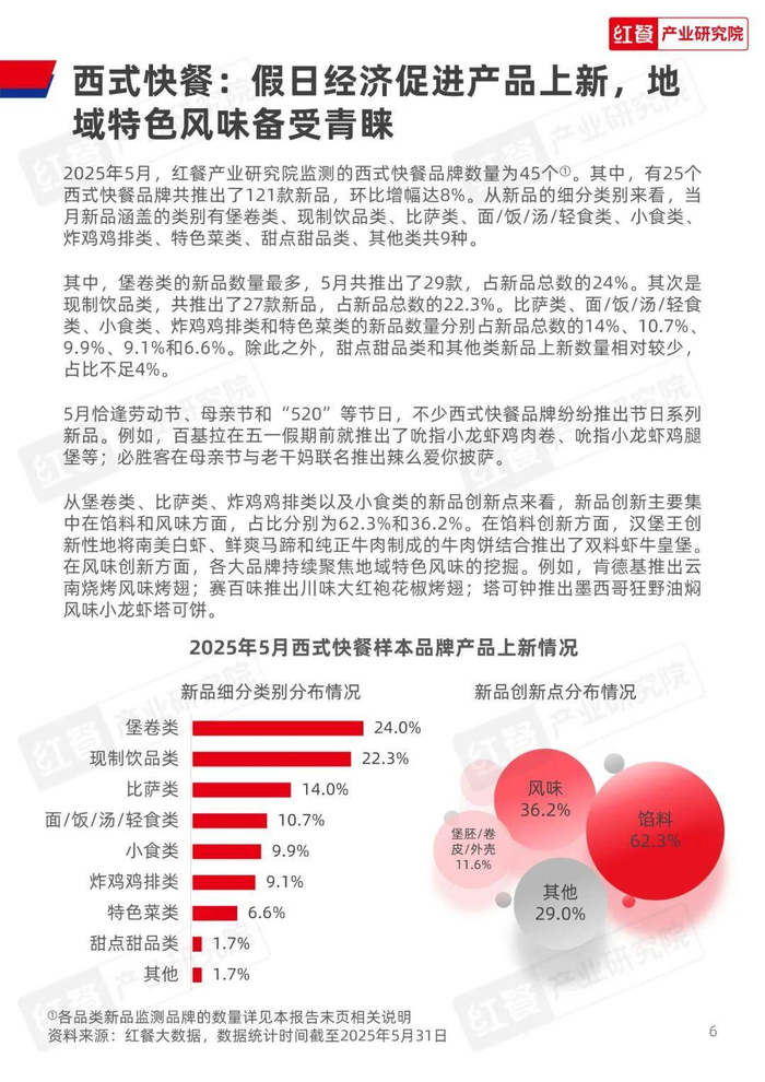 在产品创新方面,茶饮、西式快餐和粉面等品类新品突出地域风味和养生元素。西式快餐品牌推出121款新品,茶饮品牌推出242款新品,果茶类和地域风味饮品受青睐。粉面品牌推出102款新品,养生食材应用增加。咖饮、面包烘焙、火锅等品类也纷纷推出新品,水果、坚果等元素被广泛应用。