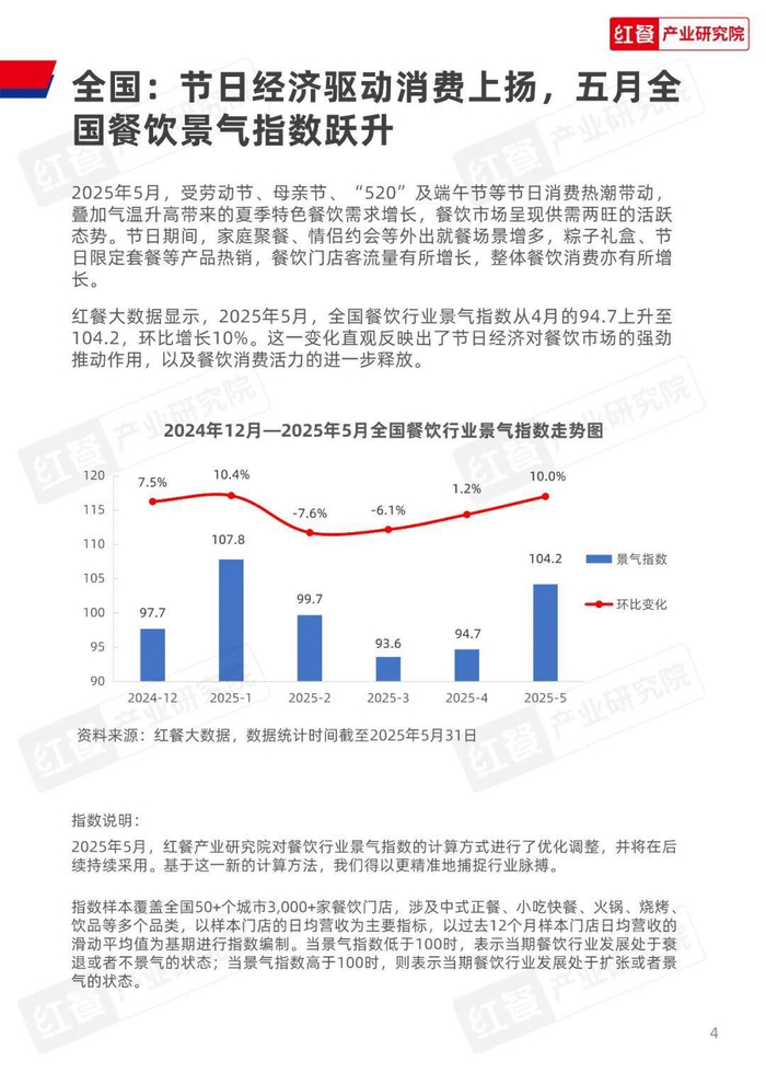 2025年5月,全国餐饮行业景气指数从4月的94.7上升至104.2,环比增长10%,主要受劳动节、母亲节、“520”及端午节等节日消费热潮带动,家庭聚餐、情侣约会等场景增多,餐饮门店客流量和整体消费显著增长。