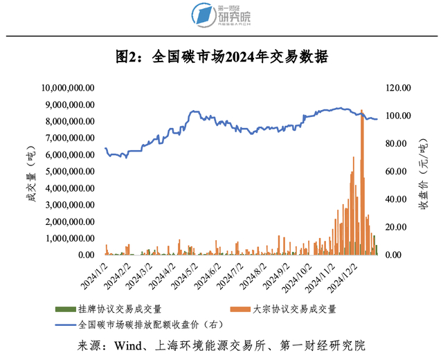 具体来看,2024年CEA总成交量1.89亿吨,总成交额181.14亿元。其中,挂牌协议交易成交量3702.74万吨,成交额36.31亿元;大宗协议交易成交量1.52亿吨,成交额144.82亿元。期间,最高价106.02元/吨,最低价69.67元/吨,收盘价较2023年最后一个交易日上涨了22.75%。截至2024年12月31日,CEA累计成交量6.30亿吨,累计成交额430.33亿元。