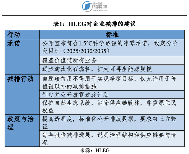 为规范非国家实体的气候行动承诺、提升透明度并推动全球气候治理的协同性,联合国秘书长授权成立了“非国家实体净零排放承诺高级别专家组”(HLEG),这一组织针对企业等非国家实体的净零排放行动提出了一套标准化、科学化的建议,为企业减排行动提供了科学样板,主要建议如表1所示。