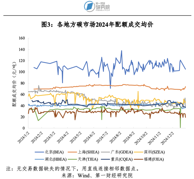 2024年,地方碳市场中,北京碳市场碳价最高,同时碳价波动幅度也最大,最高成交均价达到138.00元/吨。上海、重庆碳市场碳价相对较稳,分别在67—78元/吨和37—51元/吨之间波动。福建碳市场碳价在所有试点中最低,2024年最低为14.96元/吨,最高为37.94元/吨。