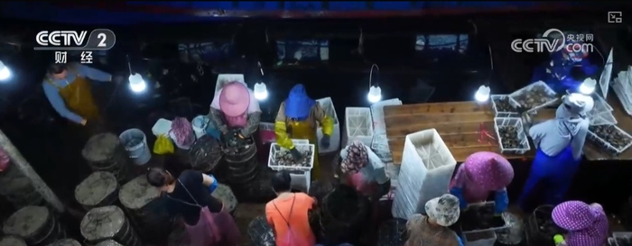 凌晨两点,近海操作台上已经泛起了星星点点的灯光。养殖户们熟练地将养殖笼拉出水面,用工具将吸附在笼壁上的鲍鱼剥落,随后分拣、称重、装筐,把鲍鱼运往市场或加工厂。