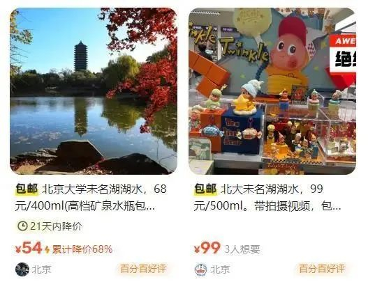 近日,据极目新闻报道,记者在某线上二手交易平台发现,多位商家售卖北京大学未名湖湖水、清华大学校河河水,每500毫升标价20元至168元不等,有商家称用“高档矿泉水瓶”包装,取水时可拍摄视频。