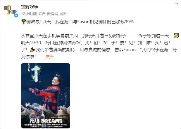 昨日,@宝辉娱乐 还发微博说:“倒数最后1天!我在海口与Eason相见倒计时已加载99%...”