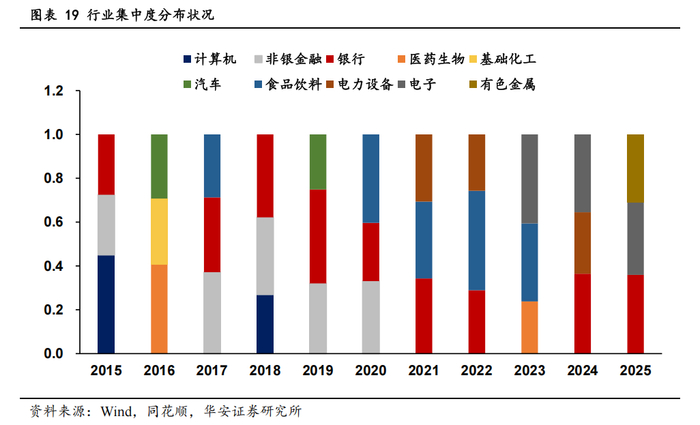 整体来看,银行在固收+基金行业配置中,一直处于核心的位置,贯穿牛熊市,银行股低波动和高股息的特点契合固收+基金稳健增长的战略需求,在熊市作为防御性配置,牛市作为打底配置提供基础收益和流动性,成为投资组合的压舱石。食品饮料行业在 2017 年、2020 年受益于消费升级,作为高 ROE 的成长股,在牛市提供收益弹性。2023 年消费股估值高位回落,反映出固收+基金对估值泡沫的规避。2023-2025 年受益于 AI 周期,电子行业占比较高,体现出高成长赛道的阶段性参与。熊市周期减少配置高波动行业,通过如银行这类低风险行业对冲权益波动,债券端托底,确保组合稳定。牛市搭配成长型和周期性行业,在银行打底的基础上,捕捉消费升级和电子行业的收益弹性,进行科学配置。
