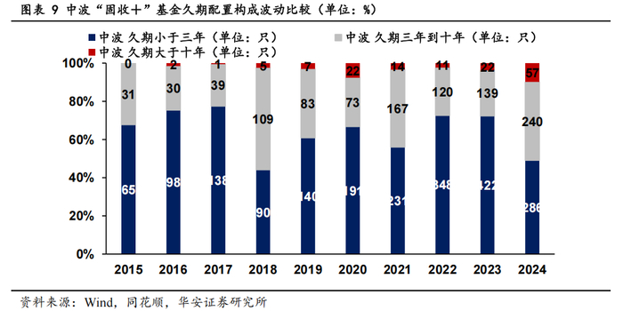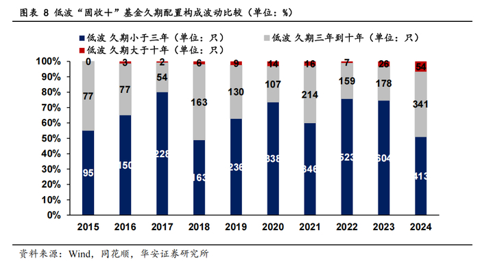 2015 年至 2024 年间,这类基金的久期配置策略呈现显著的风险偏好提升趋势:代表高波动、长久期(>5%)的部分占比从早期较低水平持续攀升,尤其在 2020 年后增速加快,至 2024 年达到历史峰值(具体数值需参考柱状图标注),而低久期(<3%)的部分则从 2015-2017 年的主导地位逐年收缩,中久期(3%-5%)的部分近年也略有下降。这一变化表明,随着市场环境演变(如低利率持续、固收资产收益承压),“固收+”基金逐步转向依赖长久期、高波动性资产(如含权益属性的可转债或信用下沉债券)来增厚收益,但 2024 年极端化配置比例的集中也提示需警惕利率反转或流动性收紧时的潜在风险敞口。