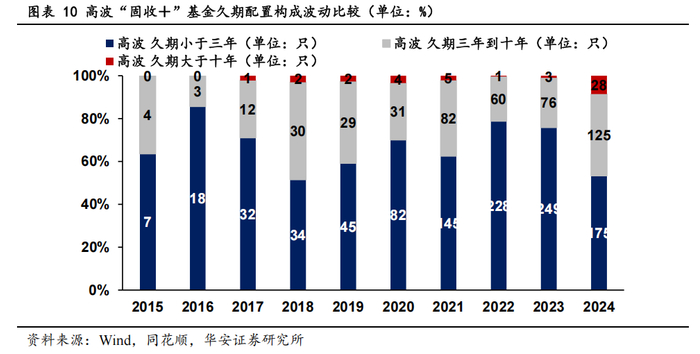 从图表揭示的高波久期配置特征可见,其策略展现出强烈的主动管理倾向:在债牛阶段(如 2015-2016、2020 年),高波“固收+”基金以更为主动的久期拉伸为核心抓手,显著压缩短期仓位,同步将中期久期配置推升至阶段峰值,甚至突破性地配置长期资产以放大资本利得;债熊阶段(如 2017、2023 年)则强化操作,通过调整短期来实现稳定收益,而中长期仓位断崖式缩减以规避估值冲击,期间甚至出现长期久期清零的情况;震荡周期(如 2019、2021 年)则既在利率波动中捕捉交易性机会,又通过超长久期配置押注预期差。这种"震荡多元化变动"的久期调控模式,与低波、中波产品形成策略差异,深刻映射出高波“固收+”基金"以波动率换收益"的底层逻辑。