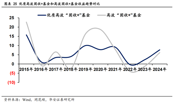 优质高波“固收+”基金(年化收益>5%,最大回撤<20%)的策略在债牛中追求收益弹性,通过大幅拉长久期(>5%)、加杠杆或配置低评级信用债、可转债等高波动资产,最大化利率下行红利;债熊时则快速切换至利率衍生品对冲(如国债期货空头),或通过纯债底仓分散风险,但允许阶段性承受较高回撤(<20%)以等待市场反转。此类基金以“高收益优先”为导向,策略风格激进,但对信用风险和流动性风险的容忍度也显著高于低中波“固收+”基金,需依赖严格的止损机制和评级筛选标的,避免策略失效。