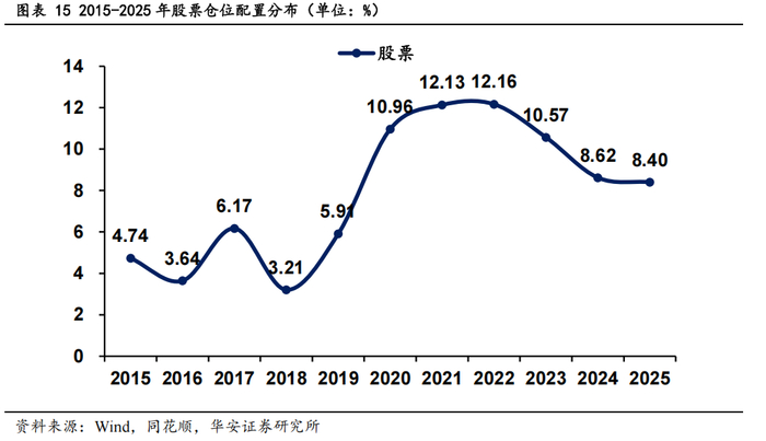 从各年度整体数据来看,股票仓位最小值为 2018 年的 3.21%,最大值为 2022 年的 12.16%,全距达到 8.95%,这表明股票仓位存在显著波动,跨度较大。股票仓位平均值为 7.86%,整体处于中低水平,但存在明显的阶段性特征,中位数为 8.40%,说明数据分布略向左偏,有较多的低值导致整体中心偏低。早期年份 2015-2019 年仓位普遍较低反映出相对保守的配置策略,2019 年之后股票仓位显著上升表明市场乐观预期推动基金增持股票,2023-2025 年略有回落但仍高于早期水平,表明资金运作策略的调整,进行风险控制。