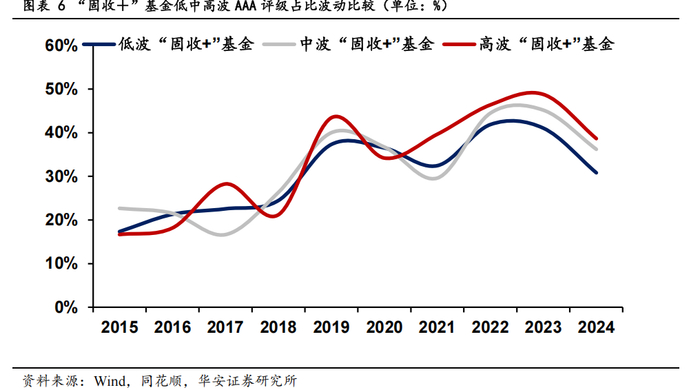 从图表走势可见,"固收+"基金中不同风险等级产品的 AAA 评级配置呈现鲜明特征。低风险偏好基金始终将高等级债券作为核心资产,其 AAA 占比随时间推移形成稳健变动的趋势,尤其在市场波动时期展现出更强烈的"向高评级聚集"倾向,凸显出资金避险需求的持续性强化;中风险基金则保持相对均衡的配置策略,AAA 占比始终围绕中枢水平小幅摆动,显示出股债平衡框架下的稳定运作模式;高风险基金呈现出截然不同的轨迹,早期虽曾短暂提升高评级债券比例,但伴随市场环境变迁,其 AAA 占比在后半周期呈现波动下探态势,反映出风险偏好上升时信用下沉的配置选择。