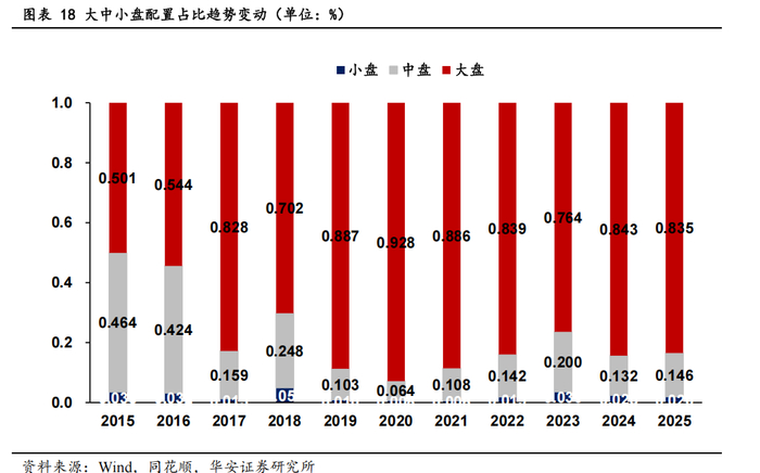 从整体分布状态来看,大盘股长期处于主导地位,2015-2020 年间,大盘配置波动式上升,体现出基金对于大盘蓝筹股的高度依赖,2021-2025 年大盘股稍有回落但仍然居于首要的位置。这主要是由于大盘股流动性相对更强,业绩稳定,契合固收+基金稳健增值的需求,因此不断强化大盘股在组合中的压舱石作用。2015-2017 年中盘股波动式下滑,反映出固收+基金随着市场进行调整,向大盘蓝筹股集中。2023 年后中盘成长股因业绩和估值的优势,成为在增强端的重要补充,市场适度提升中盘股配置比例,以此来平衡稳定性和弹性。小盘股由于风险的特性,一直以来都是少量配置。