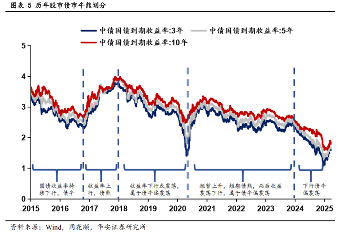根据图表数据,2015-2016 年中债国债收益率持续下行,债市处于明确牛市;2017年收益率陡峭攀升,形成典型债熊;2018 年收益率单边回落,重回债牛;2019 年收益率在 3%-3.3%区间窄幅震荡,全年无趋势性方向;2020 年国债 10 年到期收益率呈现“V 型”走势——年初因疫情收益率暴跌至 2.5%左右(短暂债牛),5 月后快速反弹至3.3%(转入债熊),但年末收于 3.1%使全年中枢仍较 2019 年下移,综合判定为债牛;2021-2022 年收益率震荡下行,延续债牛;2023 年收益率反弹,构成震荡债熊;2024-2025 年图表显示收益率再度进入下行通道,虽存在短期波动,但整体维持债牛格局。