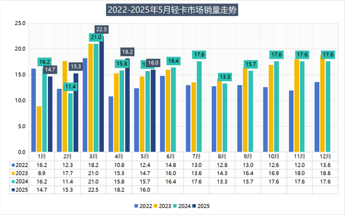 2025年5月,轻卡市场单月16万辆,虽环比下降11.9%,但相较4月环比下降19.4%缩窄,同比增长1.8%,比2024年同期低谷时15.8万辆,增长了2000多辆,与2018-2019年疫情前单月销量仍有差距。
