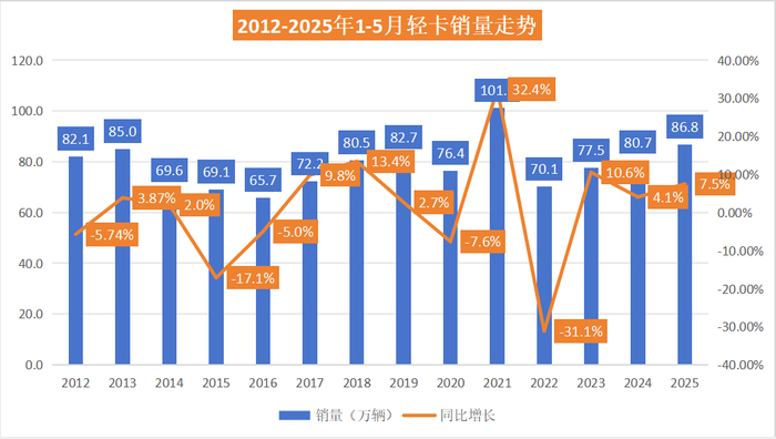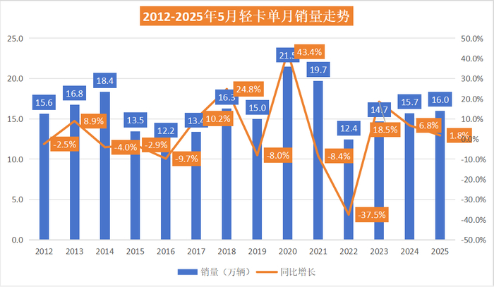 2025年5月,轻卡市场销量同比增长1.8%,在商用车、卡车大盘均为下滑的背景下实现了逆市增长。