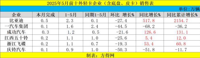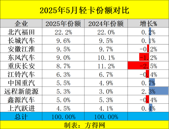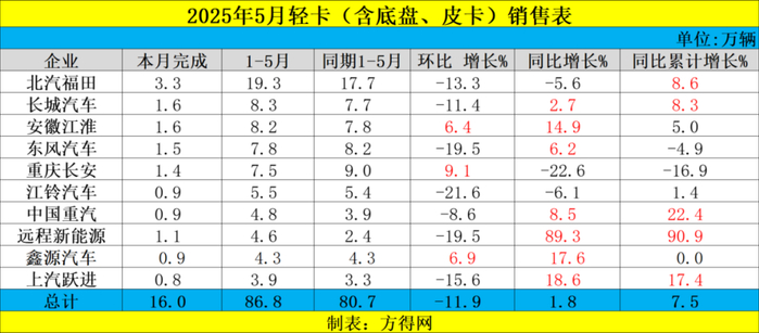 2025年5月虽不是传统旺季,但5月有7家企业实现了同比的正增长,在此背景下,哪些轻卡企业实现了超越行业的表现?