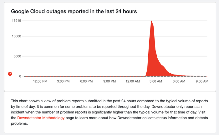 当时,宕机追踪网站 Down Detector 的峰值开始飙升。Down Detector 网站显示,太平洋夏时令时间上午 11:30 左右,Google Cloud 报告了超过 13000 起事件,不过到下午早些时候,这一数字已大幅下降。