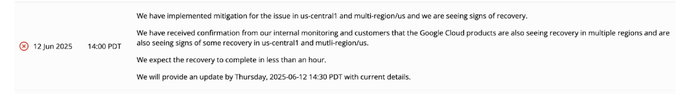 随后,经过快速的修复,太平洋夏时令下午 12 点 41 分,谷歌在谷歌云状态页面上表示,“我们的工程师已经找到了根本原因并采取了适当的缓解措施。虽然我们的工程师已确认除 us-central1 之外的所有位置的底层依赖关系均已恢复,但我们注意到,客户在各个 Google Cloud 产品上仍会受到不同程度的影响。所有相关工程团队均已积极参与并致力于服务恢复。我们还没有全面恢复服务的预计到达时间。我们将在太平洋夏令时间 2025 年 6 月 12 日星期四 13:30 之前提供最新详细信息。”
