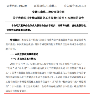 6月10日,安徽江南化工股份有限公司(以下简称“江南化工”)与四川峨边昌龙化工有限责任公司(以下简称“昌龙化工”)签署《安徽江南化工股份有限公司与四川峨边昌龙化工有限责任公司关于四川省峨边国昌化工有限责任公司之收购协议》。